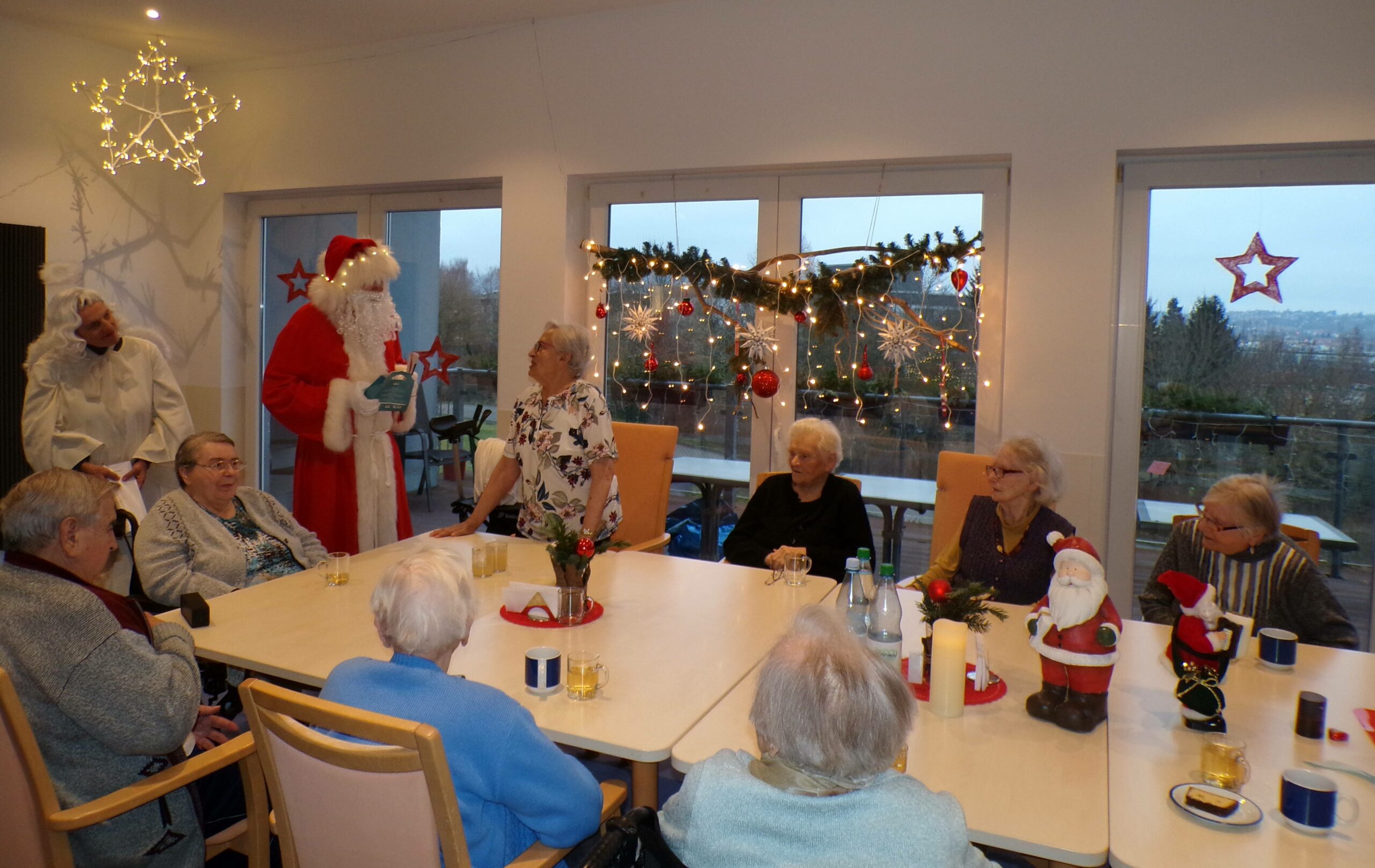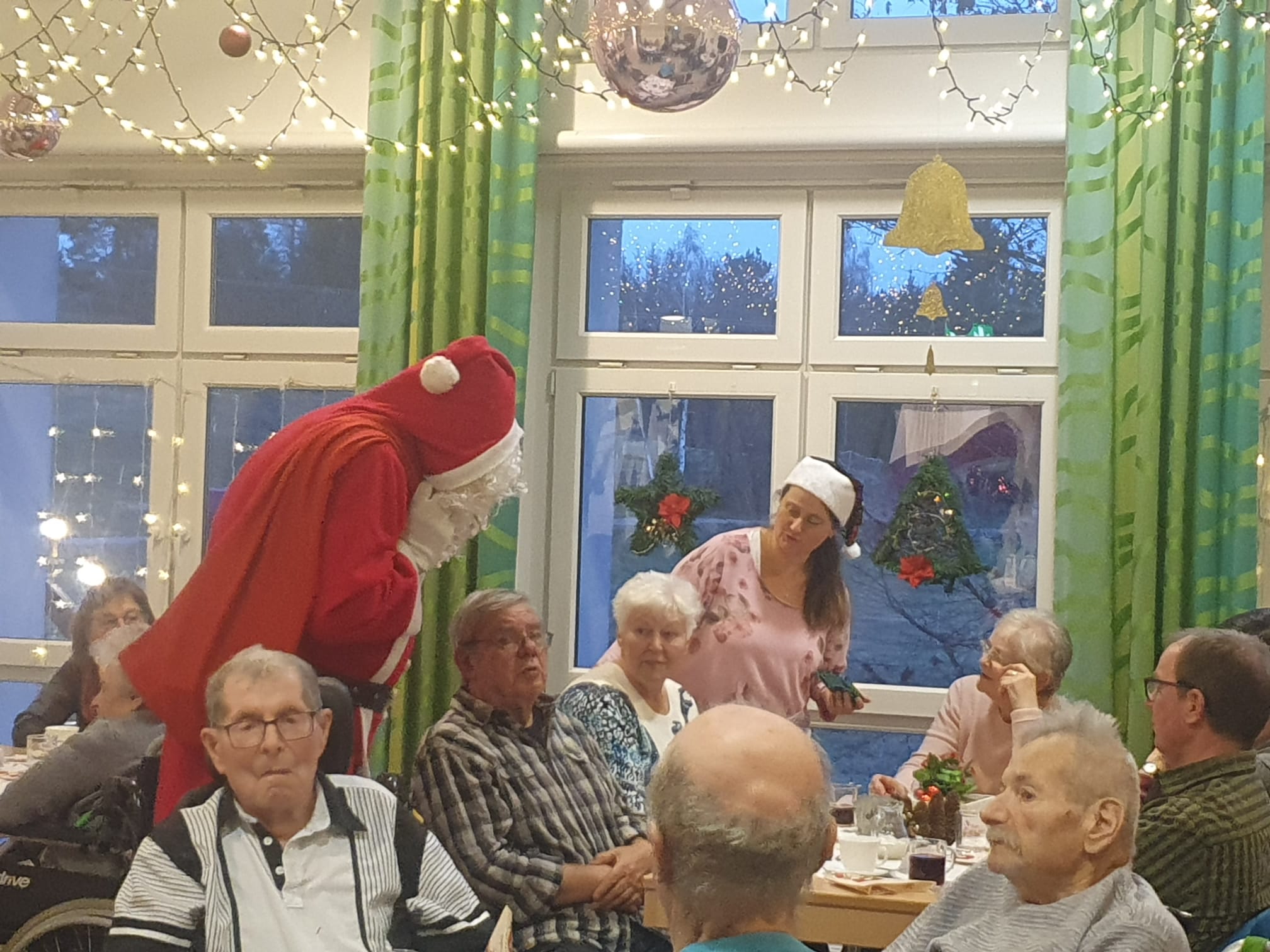 Zu den Weihnachtsfeiern der Wohnbereiche bekamen einige Senior*innen Besuch, sodass sie das Programm mit Hr. Frankenberg und ein gemütliches Kaffee trinken zusammen genießen konnten. Am Ende des Nachmittags kam natürlich der Weihnachtsmann und brachte Geschenke. Er zog im Anschluss an die Feiern weiter über die Zimmer zu all den Senior*innen, welche das nicht mehr das Bett verlassen können, um auch Ihnen weihnachtliche Grüße zu überbringen.